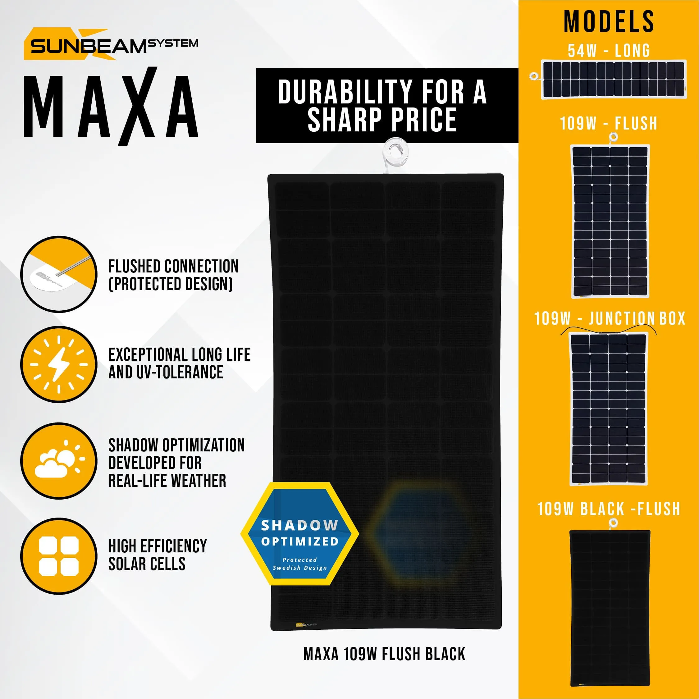 MAXA-sarja sisältää ETFE-pinnan, erittäin tehokkaat SUNPOWER MAXXEON -kennot sekä SUNBEAMsystemin itse Ruotsissa kehittämät teknologiat – joita tavallisesti löytyy vain eksklusiivisemmasta Tough-sarjasta – kuten Shadow Optimized ja Flushed Soft Junction.