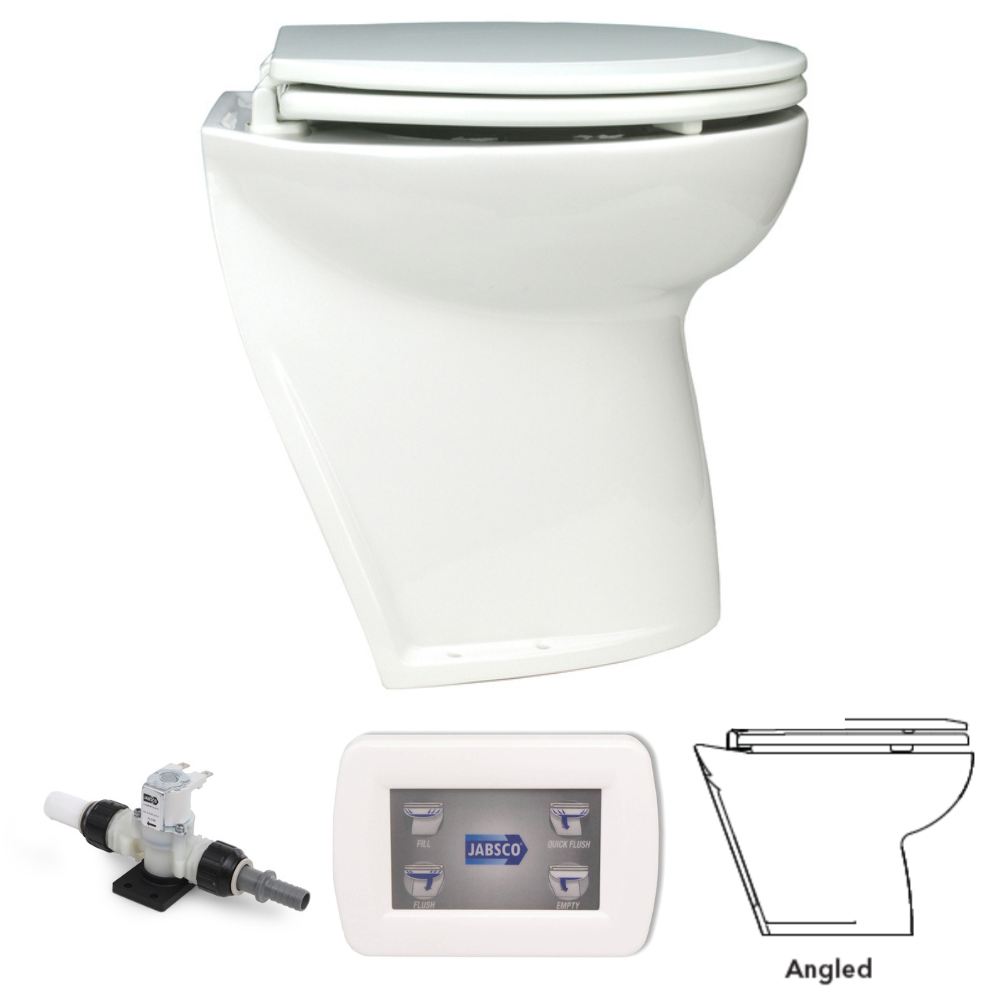 Jabsco Deluxe Flush on malliston hiljaisin ja tyylikkäimmin muotoiltu sähkövessa. Mallia käytetään useissa huippulaadukkaissa huvijahdeissa, kuten Nordstar ja Sargo mallistot. Deluxe Flush vessa on saatavilla 12v ja 24v järjestelmiin, omalla huuhtelupumpulla merivesijärjestelmiin tai solenoidiventtiilillä kytkettäväksi veneen olemassa olevaan makeavesijärjestelmään. Lasitettu posliinikulho on saatavilla suoralla tai viistolla takaosalla ja kahdella eri korkeudella 14″ (36 cm) tai 17″ (44 cm). Lasitetun posliinikulhon koko on aina normaalia kodin vessaa vastaava ja kansi äänettömästi sulkeutuva Soft Close malli. Katso koko malliston taulukko alta.