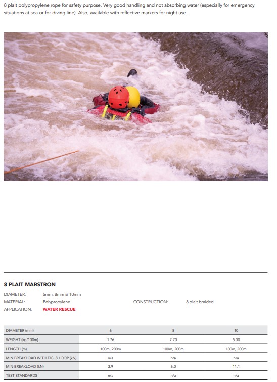 Kevyt, hyvin näkyvä ja kelluva köysi. Pehmeä ja helposti käsiteltävä 8-säikeinen Marstron sopii erinomaisesti pelastusheittoliinoihin, hinausköysiksi ja varmistusnaruksi (painter). Valmistettu korkealujuuksisesta polypropeenista, eikä ime vettä, joten säilyy joustavana ja miellyttävänä käsitellä.