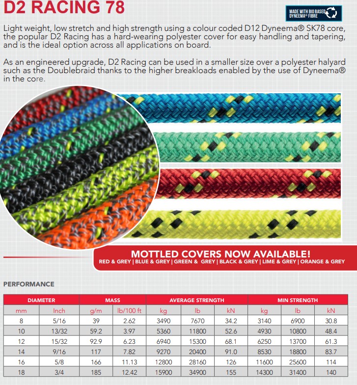 24-säikeinen polyesterivaippa kulkee sujuvasti ja pitää hyvin, tarjoten erinomaisen suorituskyvyn köysilukoissa, jammereissa ja vinsseissä. Se antaa myös hyvän kulutuskestävyyden ja pitkän käyttöiän. D2 Racing on helppo splissata ja kaventaa (taperoida), mikä parantaa takilan turvallisuutta, ja kirkasvärinen polyesterivaippa on helposti tunnistettavissa.