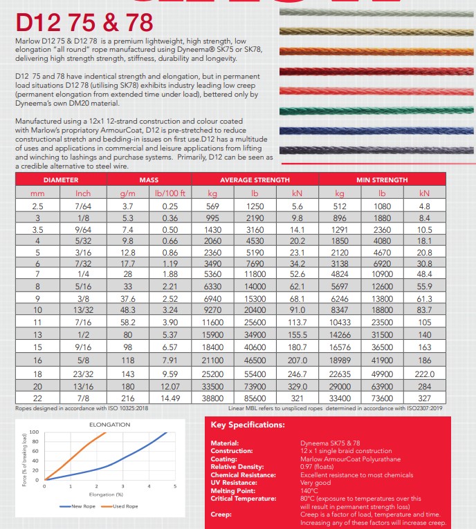 D12 78 on Marlow:n premium-luokan esivenytetty 12-säikeinen köysisarja, joka on valmistettu biopohjaisesta Dyneema SK78 -kuidusta. Saatavana halkaisijoissa aina 22 mm asti. D12 78 on tunnettu keveydestään, vähäisestä venymästään ja suuresta lujuudestaan, mikä tekee siitä erinomaisen vaihtoehdon teräsvaijerin korvaajaksi.