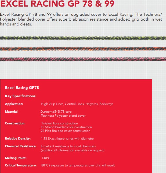 Excel Racing GP78/GP99 on erittäin luja ja sen viruma on minimaalinen. Technora-sekoitteinen vaippa tarjoaa erinomaisen kulutus- ja lämmönkestävyyden. Lisäksi Technora-seos parantaa pitoa märissä käsissä, ja köysi on helppo kaventaa, paljastaen väriltään yhteensopivan ArmourCoat-ytimen. Ihanteellinen falleiksi, skuuteiksi ja korkean lujuuden säätököysiksi.