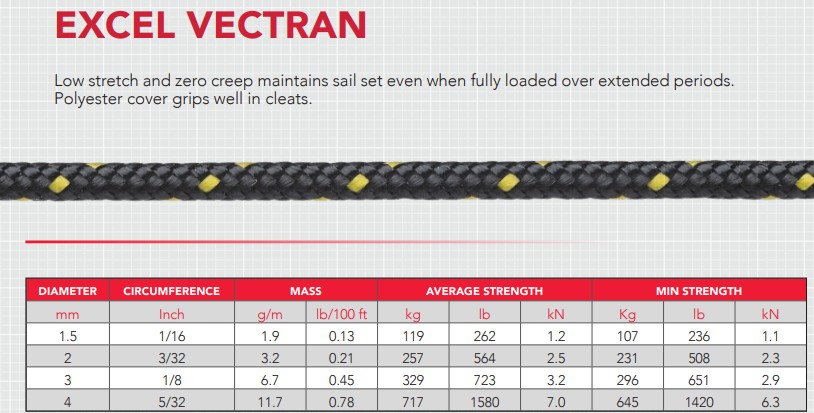 Vähävenyinen ja ilman virumaa oleva Vectran-ydin yhdessä polyesterivaipan kanssa tarjoaa korkean lujuuden ja säilyttää säädöt myös pitkäaikaisessa, täydellä kuormalla käytössä.