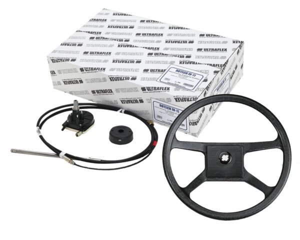 OHJAUSRUMPU T67 | 9513025130. Iskunkestävästä muovista valmistettu ohjauspesä ja painevaluna valmistettu ohjausratas varmistavat tarkan ja varman ohjattavuuden. Notkea monisäikeinen kaapeli helpottaa asennusta. Soveltuu 2-tahti perämoottoreille alle 55 hv ja pienille uppoumarunkoveneille. kaapelin pienin taivutussäde 200 mm ohjauspyörän kierto 2,5 kierrosta liike 230 mm työntövoima 120 kg, 1200 N, 40 kW asti ohjauspyörän halkaisija max 380 mm EN 29775 Safety standards, Norske Veritaksen hyväksymä T-67 ohjauspesä (musta). OHJAUSKAAPELI M58 | 9513025142. Notkea, monisäikeinen ohjauskaapeli, jonka pienin taivutussäde on 200 mm. Kuoren Ø 15 mm, sisävaijeri Ø 5 mm, kierrevaijerin päältä Ø 7,5 mm. pituus 3,6 m. OHJAUSPYÖRÄ V32 | 9513024047. Thermoplast-muovia, musta, halkaisija 340 mm.