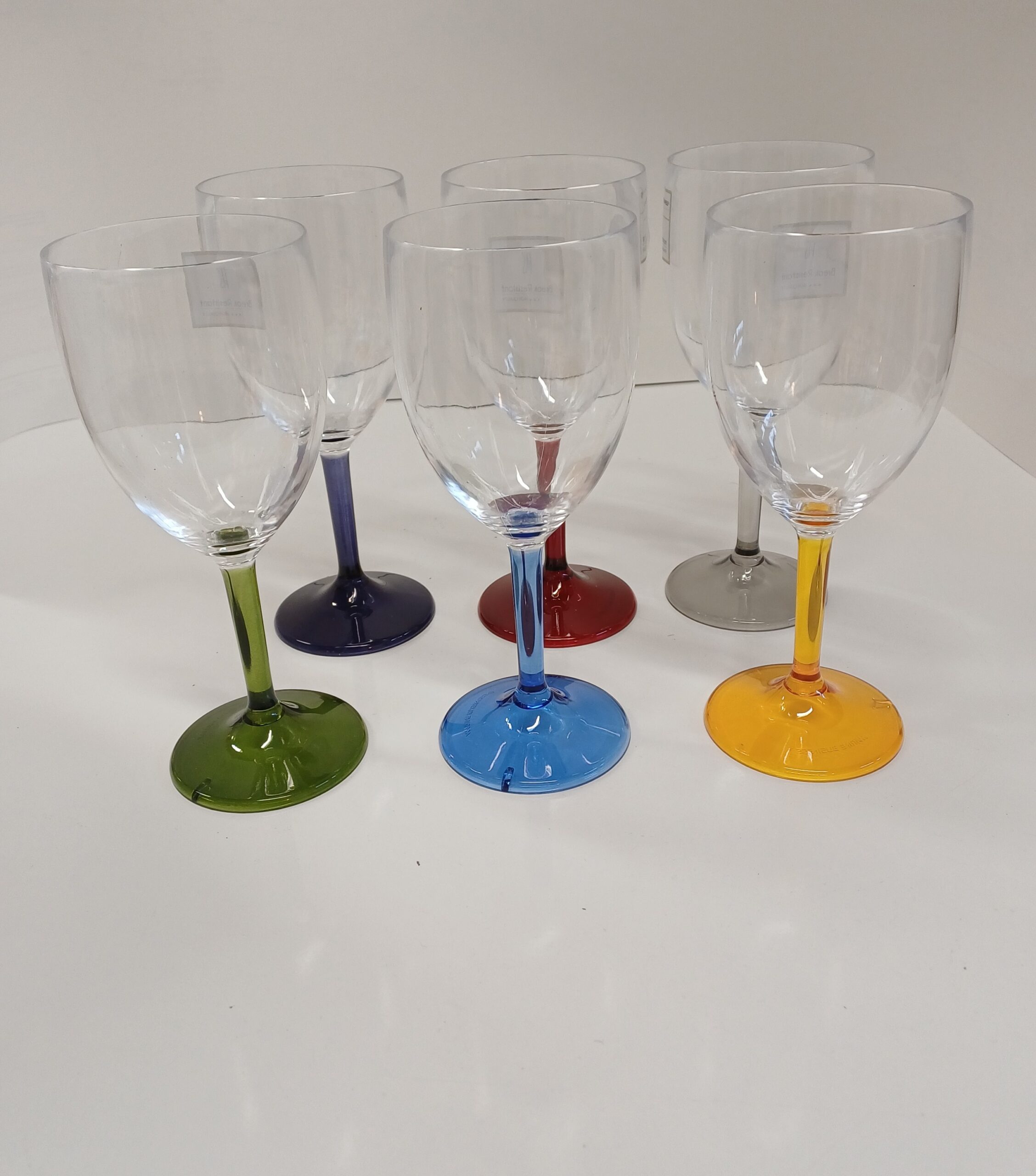 Pakkuksessa on kuusi lasia ja jokaisella on erivärinen jalka jotta kukin helpommin erottaa oman lasinsa. Ne tuovat myös hieman iloista väriä juhliin. Sopivat myös vesilaseiksi.