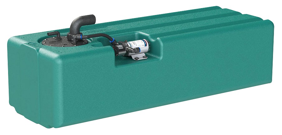 Muovinen vesitankki 107 ltr sisältäen painevesipumpun ja liittimet. Pumppu UP2E, 12/24 V, 3/8” liittimet, täyttöliitin Ø 38 mm. Virtausnopeus 12 l./min.
