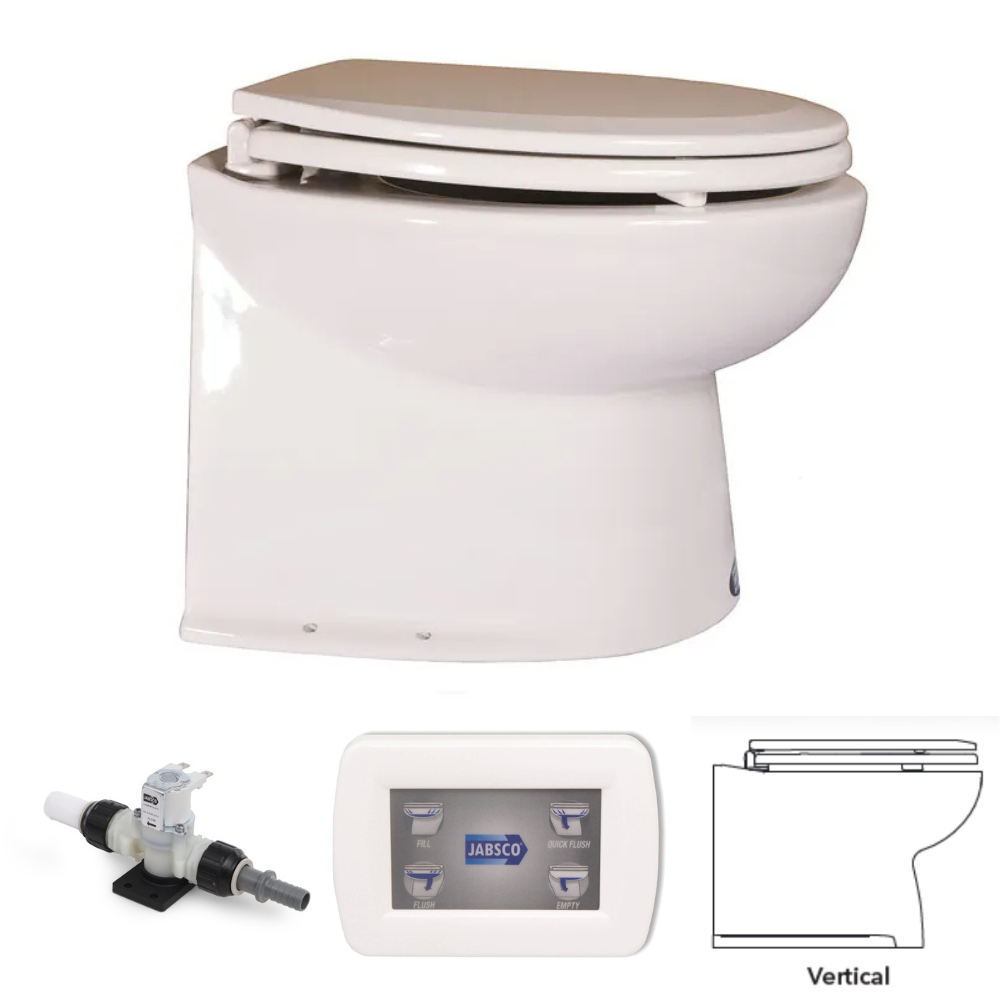Jabsco Deluxe Flush on malliston hiljaisin ja tyylikkäimmin muotoiltu sähkövessa. Mallia käytetään useissa huippulaadukkaissa huvijahdeissa, kuten Nordstar ja Sargo mallistot. Deluxe Flush vessa on saatavilla 12v ja 24v järjestelmiin, omalla huuhtelupumpulla merivesijärjestelmiin tai solenoidiventtiilillä kytkettäväksi veneen olemassa olevaan makeavesijärjestelmään. Lasitettu posliinikulho on saatavilla suoralla tai viistolla takaosalla ja kahdella eri korkeudella 14″ (36 cm) tai 17″ (44 cm). Lasitetun posliinikulhon koko on aina normaalia kodin vessaa vastaava ja kansi äänettömästi sulkeutuva Soft Close malli. Katso koko malliston taulukko alta.
