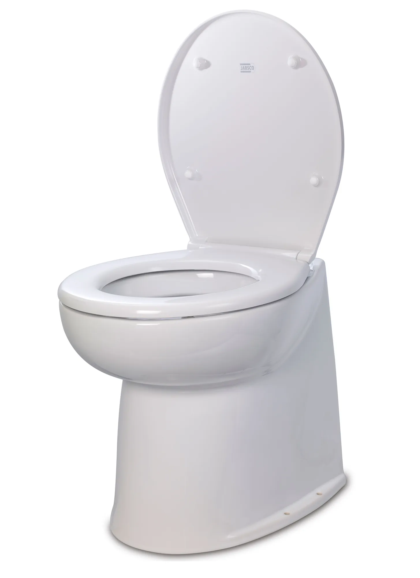 Jabsco Deluxe Flush on malliston hiljaisin ja tyylikkäimmin muotoiltu sähkövessa. Mallia käytetään useissa huippulaadukkaissa huvijahdeissa, kuten Nordstar ja Sargo mallistot. Deluxe Flush vessa on saatavilla 12v ja 24v järjestelmiin, omalla huuhtelupumpulla merivesijärjestelmiin tai solenoidiventtiilillä kytkettäväksi veneen olemassa olevaan makeavesijärjestelmään. Lasitettu posliinikulho on saatavilla suoralla tai viistolla takaosalla ja kahdella eri korkeudella 14″ (36 cm) tai 17″ (44 cm). Lasitetun posliinikulhon koko on aina normaalia kodin vessaa vastaava ja kansi äänettömästi sulkeutuva Soft Close malli. Katso koko malliston taulukko alta.