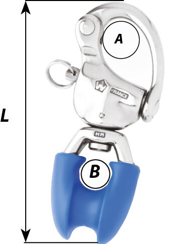 Vankkarakenteinen HR-pikalukittava skuuttihaka koussisilmukalla, valmistettu taotusta 17.4 PH -luokan ruostumattomasta teräksestä. Koussisilmukka mahdollistaa fallin päätöspunoksen kiinnittämisen suoraan sakkeliin ilman erillistä koussia, mikä vähentää köyden kulumista ja yksinkertaistaa asennusta.